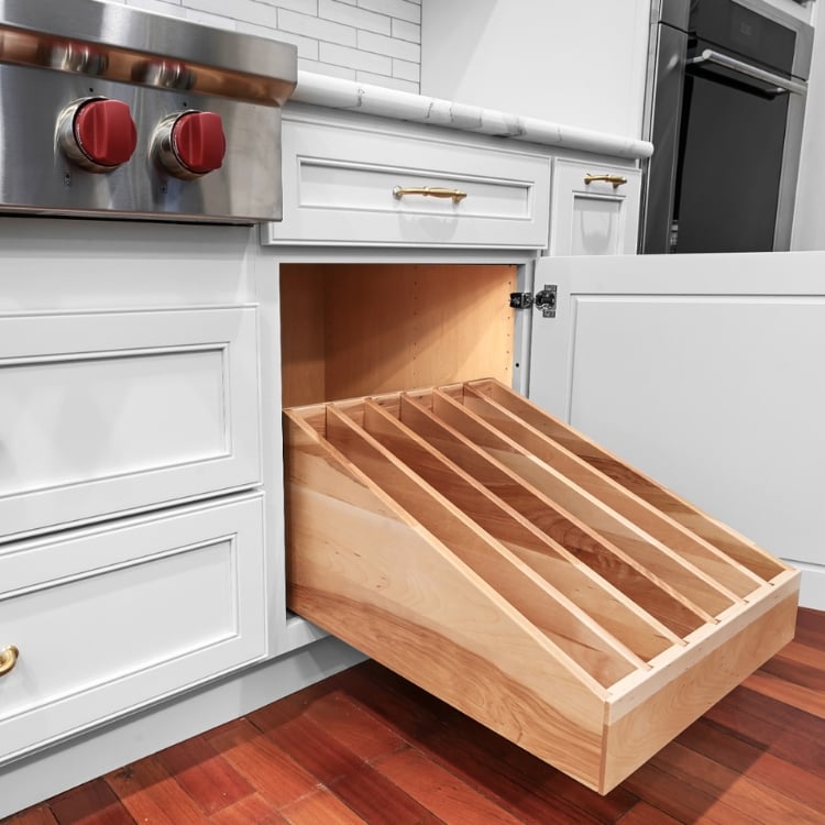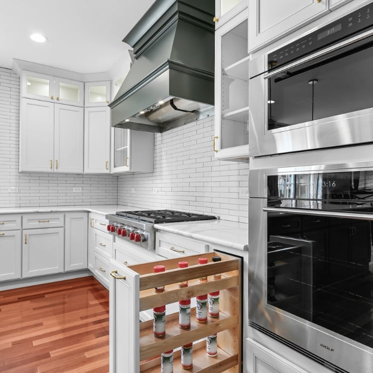 There are many kitchen layouts that work for families. Design and layout depend on many factors such as electrical placement for lighting and appliances. In this particular project we moved the refrigerator and removed their small pantry in order to open up the space and allow room for the cooktop and double oven. The pull-out spice rack cabinet and tray divider are directly to the right of the cooktop, allowing an ideal work space configuration. In this kitchen, everything is right where you need it to be. Now that’s smart design!